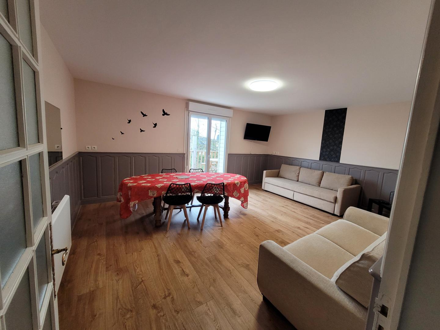 - un salon/salle à manger avec une télévision écran plat, une table basse, deux canapés 3 places dont 1 convertible en lit de 140x200cm, une table à manger et chaises.
